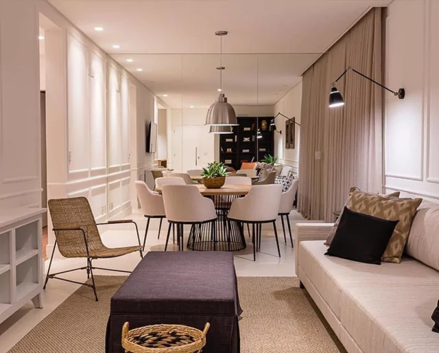 Mesa de Jantar Costa em Carvalho Hanover rodeada de Cadeiras Garne de pés finos em Linho Premium Off-white, tudo por Vitor Linsmeyer para a Mittisa.